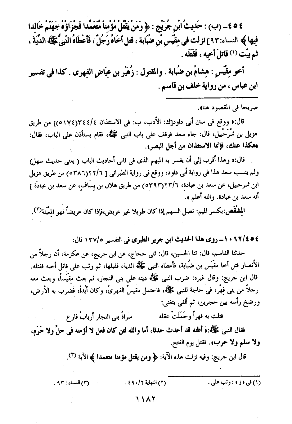454- (ب): حديث ابن جريج: {ومن يقتل مؤمناً متعمداً فجزاؤه جهنم خالداً فيها} نزلت في مقيس بن ضبابة، قتل أخاه رجلٌ، فأعطاه النبي صلى الله عليه وسلم الدية، ثم بيت قاتل أخيه، فقتله.