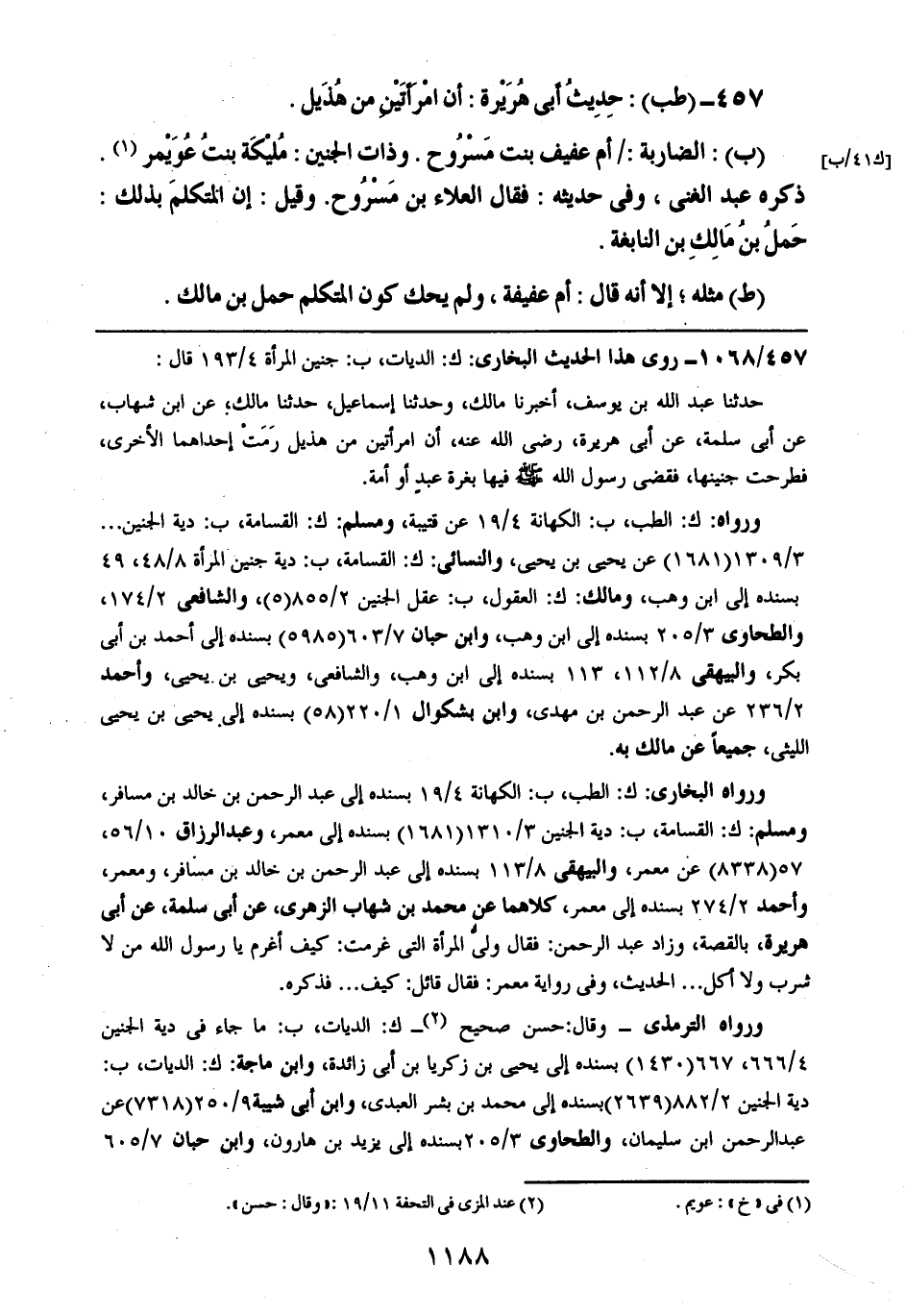 (ب): الضاربة: أم عفيف بنت مسروح. وذات الجنين: مليكة بنت عويمر. ذكره عبد الغني، وفي حديثه: فقال العلاء بن مسروح. وقيل: إن المتكلم بذلك حمل بن مالك بن النابغة.