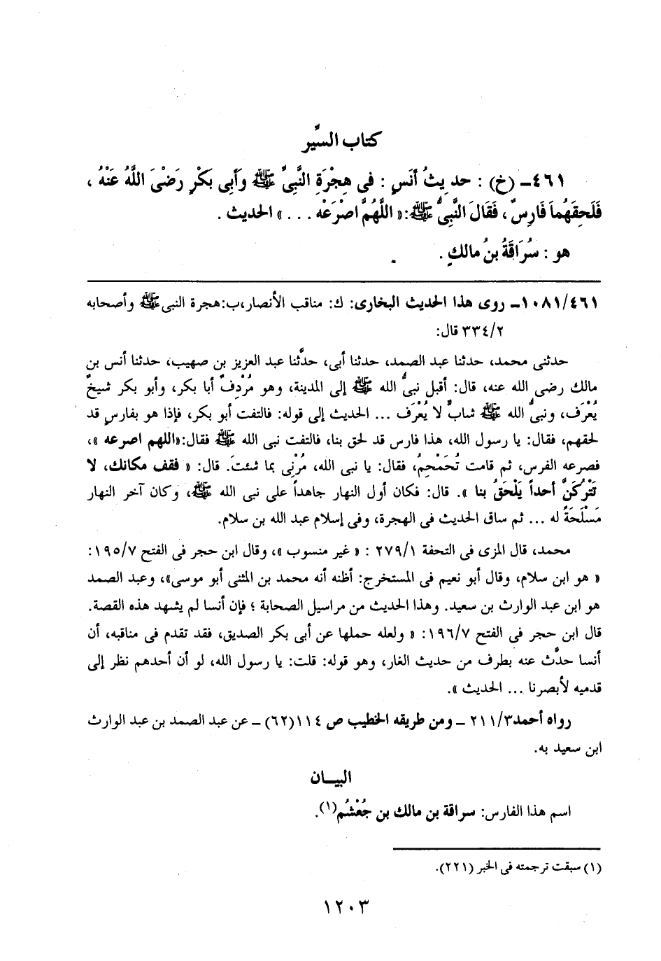 461- (خ): حديث أنسٍ: في هجرة النبي صلى الله عليه وسلم وأبي بكر رضي الله عنه، فلحقهما فارسٌ، فقال النبي صلى الله عليه وسلم: ((اللهم اصرعه .. .. )) الحديث.