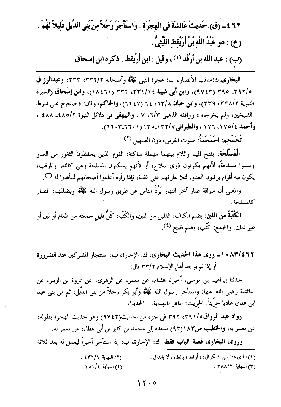 462- (ق): حديث عائشة في الهجرة: واستأجر رجلاً من بني الديل دليلاً لهم.