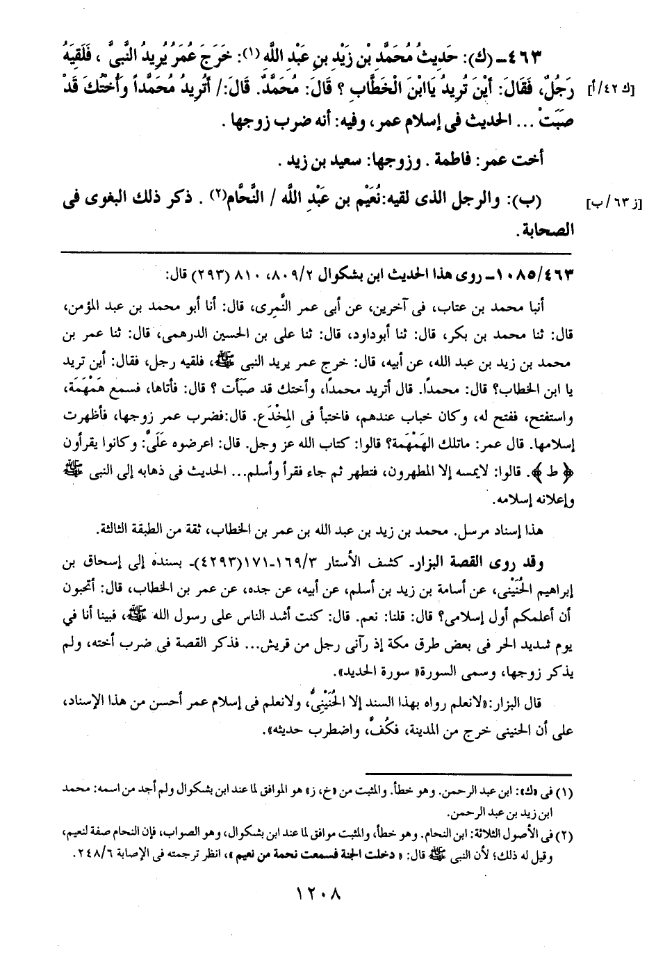 463- (ك): حديث محمد بن زيد بن عبد الله: خرج عمر يريد النبي، فلقيه رجلٌ، فقال: أين تريد يا ابن الخطاب؟ قال: محمد. قال: أتريد محمداً وأختك قد صبت .. .. الحديث في إسلام عمر، وفيه: أنه ضرب زوجها.