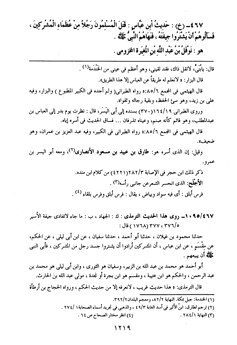 467- (خ): حديث ابن عباسٍ: قتل المسلمون رجلاً من عظماء المشركين، فسألوهم أن يشتروا جيفته، فنهاهم النبي صلى الله عليه وسلم.
