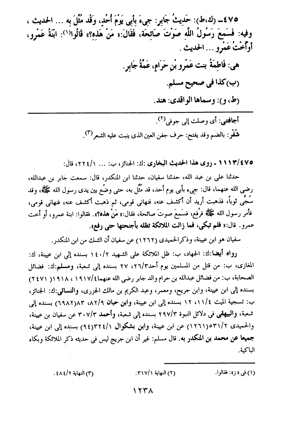 475- (ك، ط): حديث جابرٍ: جيء بأبي يوم أحدٍ، وقد مثل به .. .. الحديث، وفيه: فسمع رسول الله صوت صائحة، فقال: ((من هذه)) قالوا: ابنة عمرو، أو أخت عمروٍ .. .. الحديث.