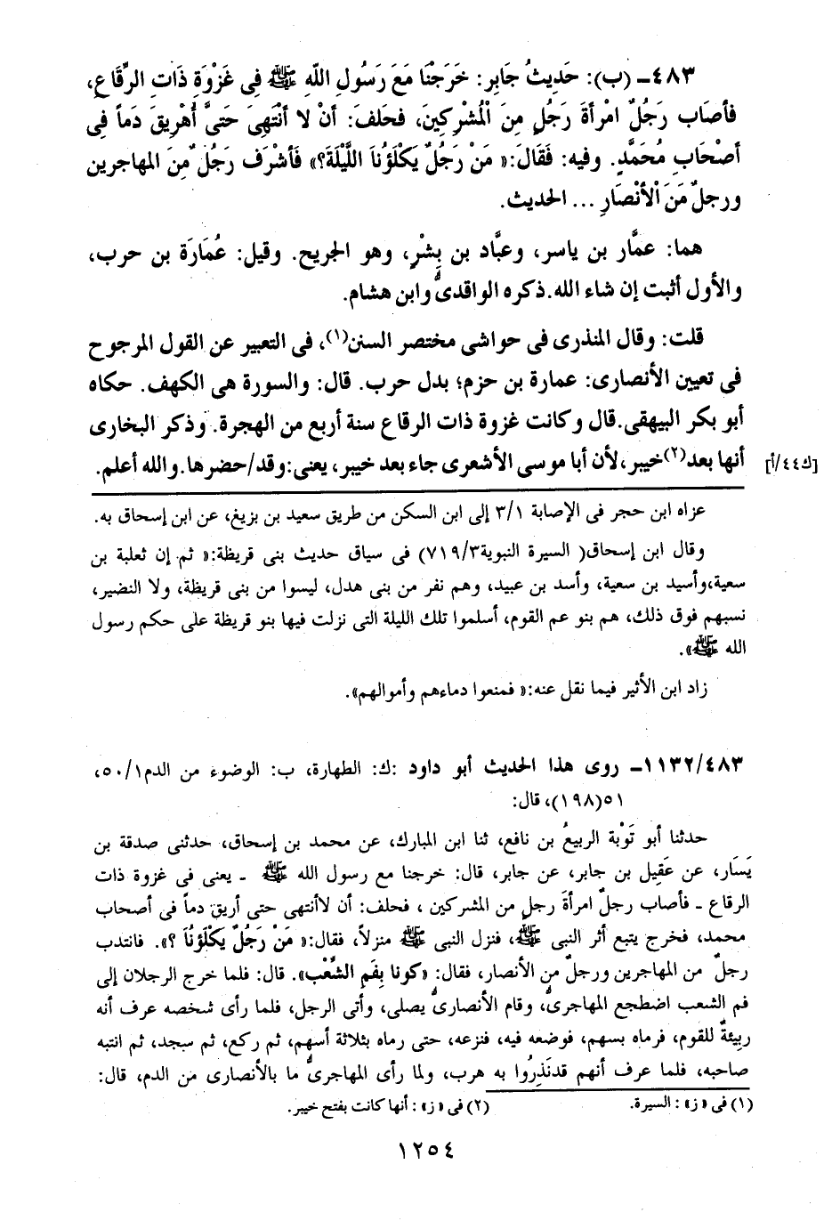 483- (ب): حديث جابر: خرجنا مع رسول الله صلى الله عليه وسلم في غزوة ذات الرقاع، فأصاب رجلٌ امرأة رجلٍ من المشركين، فحلف: أن لا أنتهي حتى أهريق دماً في أصحاب محمدٍ. وفيه: فقال: ((من رجلٌ يكلؤنا الليلة؟)) فأشرف رجلٌ من المهاجرين ورجلٌ من الأنصار .. .. الحديث.