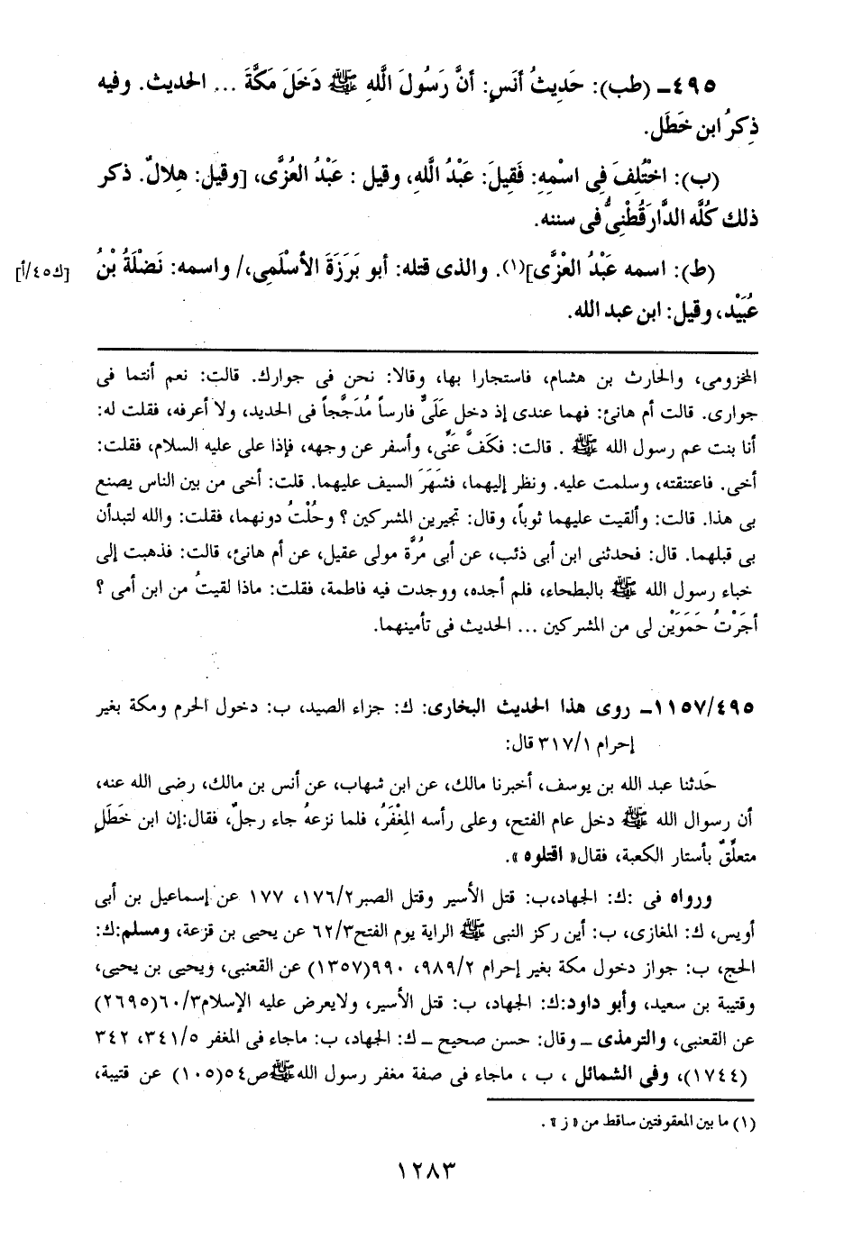 495- (طب): حديث أنسٍ: أن رسول الله صلى الله عليه وسلم دخل مكة .. .. الحديث. وفيه ذكر ابن خطل.