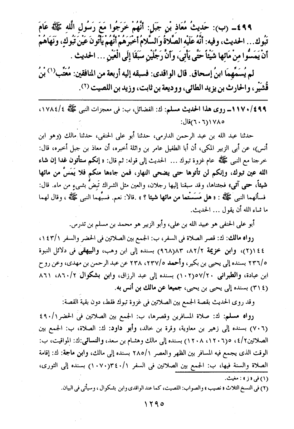 499- (ب): حديث معاذ بن جبلٍ: أنهم خرجوا مع رسول الله صلى الله عليه وسلم عام تبوك.. الحديث، وفيه أنه عليه الصلاة والسلام أخبرهم أنهم يأتون عين تبوكٍ، ونهاهم أن يمسوا من مالها شيئاً حتى يأتي، وأن رجلين سبقا إلى العين .. .. الحديث.