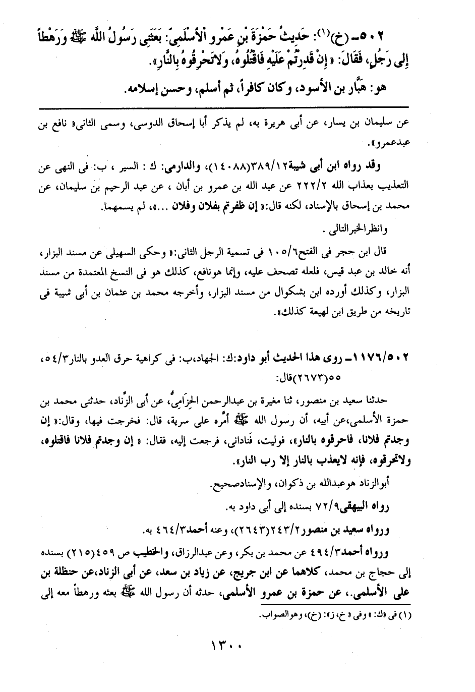 502- (خ): حديث حمزة بن عمرو الأسلمي: بعثني رسول الله صلى الله عليه وسلم ورهطاً إلى رجلٍ، فقال: ((إن قدرتم عليه فاقتلوه، ولا تحرقوه بالنار)).