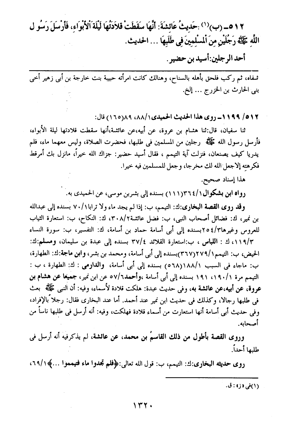 512- (ب): حديث عائشة: أنها سقطت قلادتها ليلة الأبواء، فأرسل رسول الله صلى الله عليه وسلم رجلين من المسلمين في طلبها .. .. الحديث.