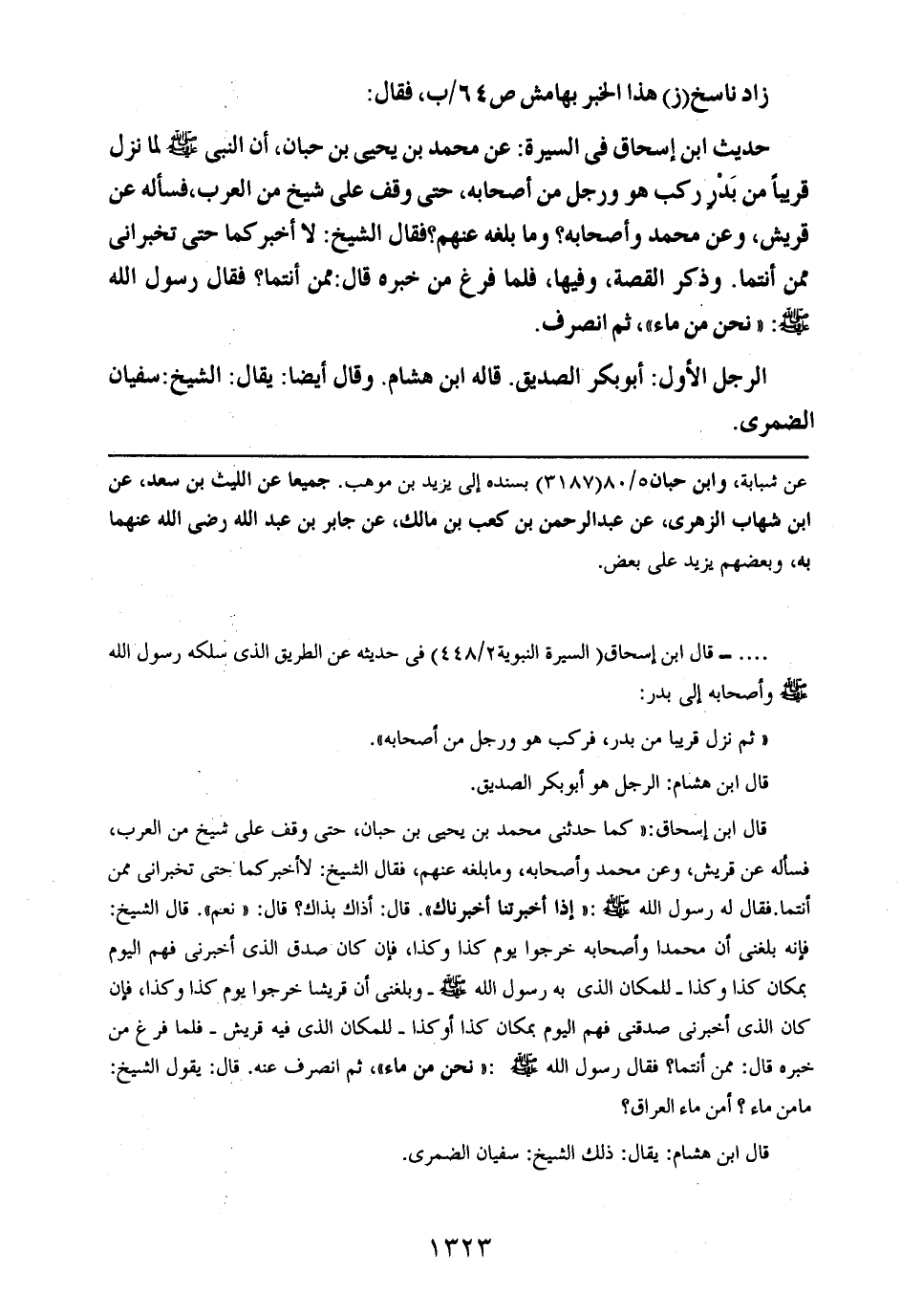 حديث ابن إسحاق في السيرة: عن محمد بن يحيى بن حبان، أن النبي صلى الله عليه وسلم لما نزل قريباً من بدرٍ ركب هو ورجل من أصحابه، حتى وقف على شيخ من العرب، فسأله عن قريش، وعن محمد وأصحابه؟ وما بلغه عنهم؟ فقال الشيخ: لا أخبركما حتى تخبراني ممن أنتما. وذكر القصة، وفيها، فلما فرغ من خبره قال: ممن أنتما؟ فقال رسول الله صلى الله عليه وسلم: ((نحن من ماء))، ثم انصرف.
