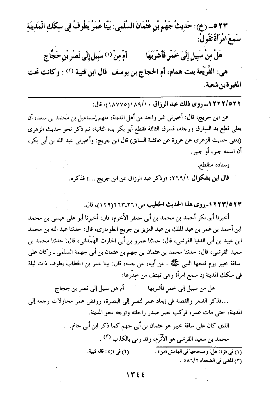 523- (خ): حديث جهم بن عثمان السلمي: بينا عمر يطوف في سكك المدينة سمع امرأةً تقول: