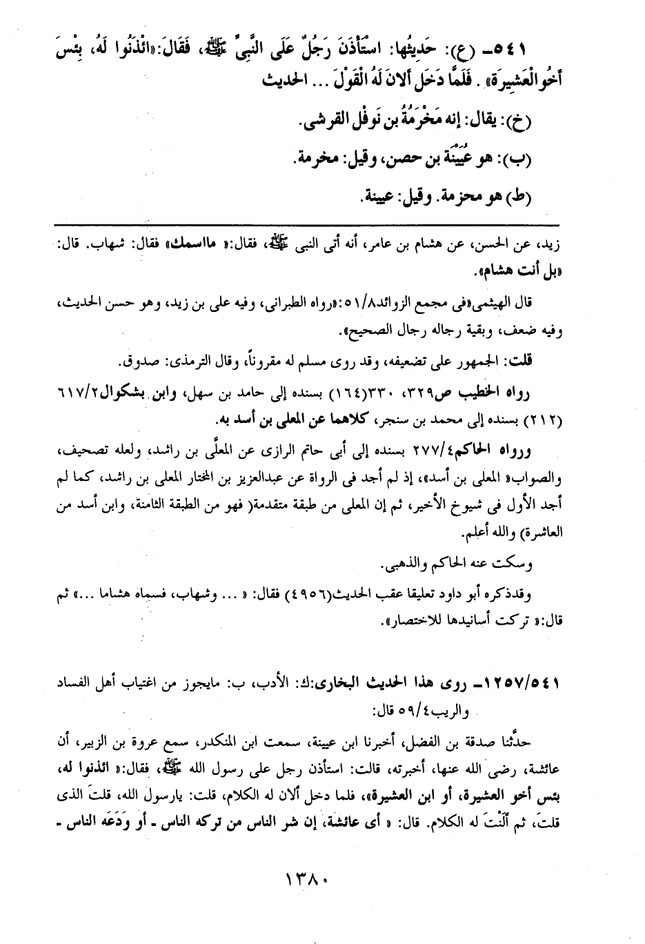 541- (ع): حديثهما: استأذن رجلٌ على النبي صلى الله عليه وسلم، فقال: ((ائذنوا له، بئس أخو العشيرة)). فلما دخل ألان له القول .. .. الحديث.