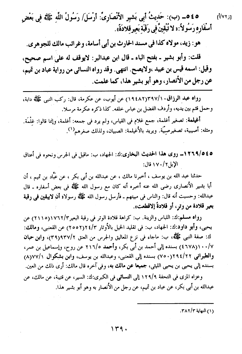 545- (ب): حديث أبي بشير الأنصاري: أرسل رسول الله صلى الله عليه وسلم في بعض أسفاره رسولاً: ((لا تبقين في رقبة بغير قلادةً)).