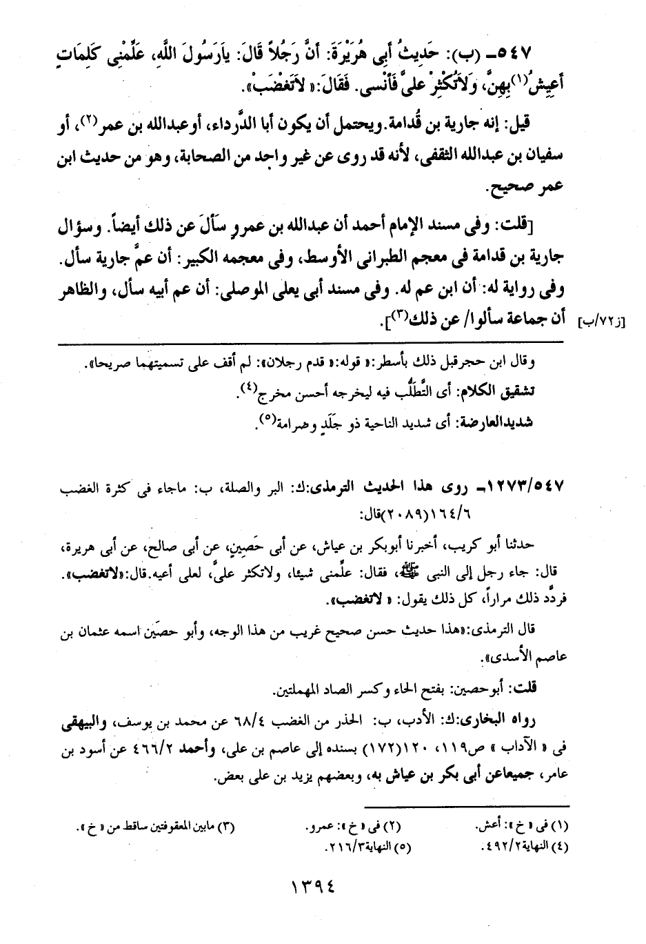 547- (ب): حديث أبي هريرة: أن رجلاً قال: يا رسول الله علمني كلمات أعيش بهن، ولا تكثر علي فأنسى. فقال: ((لا تغضب)).