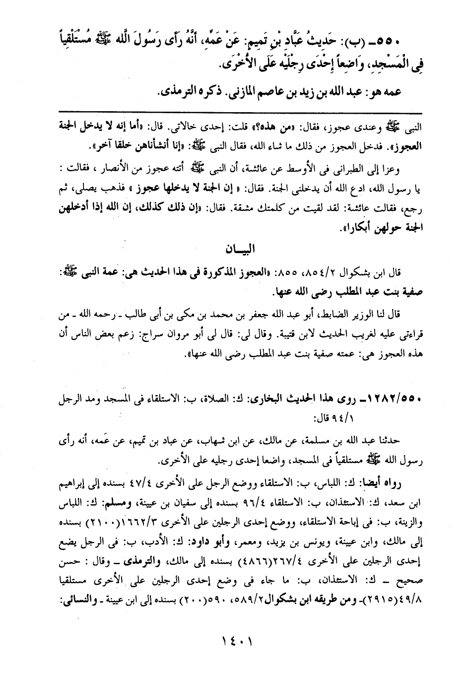 550- (ب): حديث عباد بن تميمٍ: عن عمه، أنه رأى رسول الله صلى الله عليه وسلم مستلقياً في المسجد، واضعاً إحدى رجليه على الأخرى.
