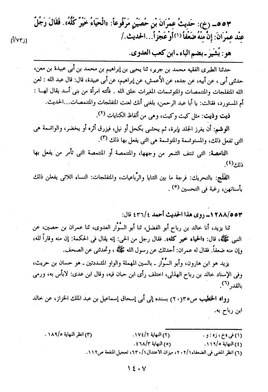 553- (خ): حديث عمران بن حصينٍ مرفوعاً: ((الحياء خيرٌ كله)). فقال رجلٌ عند عمران: إن منه ضعفاً أو عجزاً.. الحديث.
