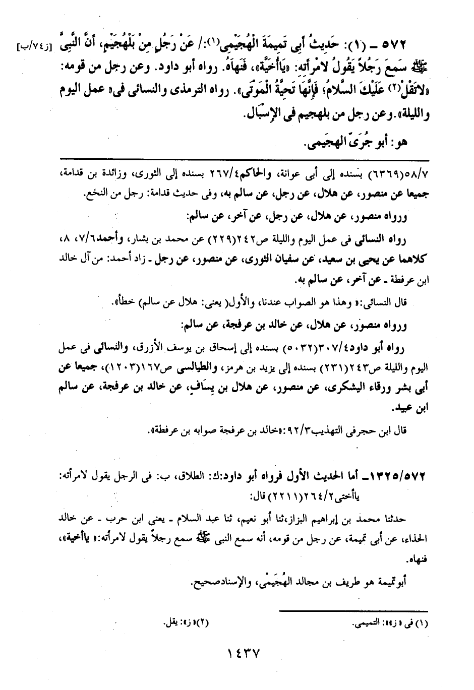 572- (1): حديث أبي تميمة الهجيمي: عن رجلٍ من بلهجيمٍ، أن النبي صلى الله عليه وسلم سمع رجلاً يقول لامرأته: ((يا أخية)) فنهاه. رواه أبو داود. وعن رجل من قومه: ((لا تقل عليك السلام؛ فإنها تحية الموتى)). رواه الترمذي والنسائي في ((عمل اليوم والليلة)). وعن رجل من بلهجيم في الإسبال.
