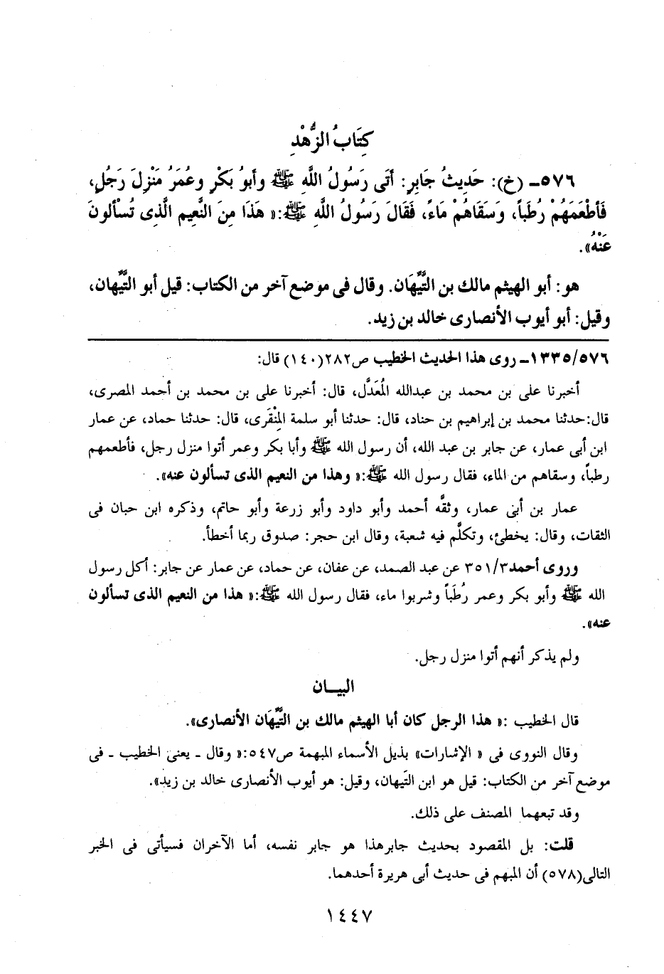 576- (خ): حديث جابرٍ: أتى رسول الله صلى الله عليه وسلم وأبو بكر وعمر منزل رجلٍ، فأطعمهم رطباً، وسقاهم ماءً، فقال رسول الله صلى الله عليه وسلم: ((هذا من النعيم الذي تسألون عنه)).