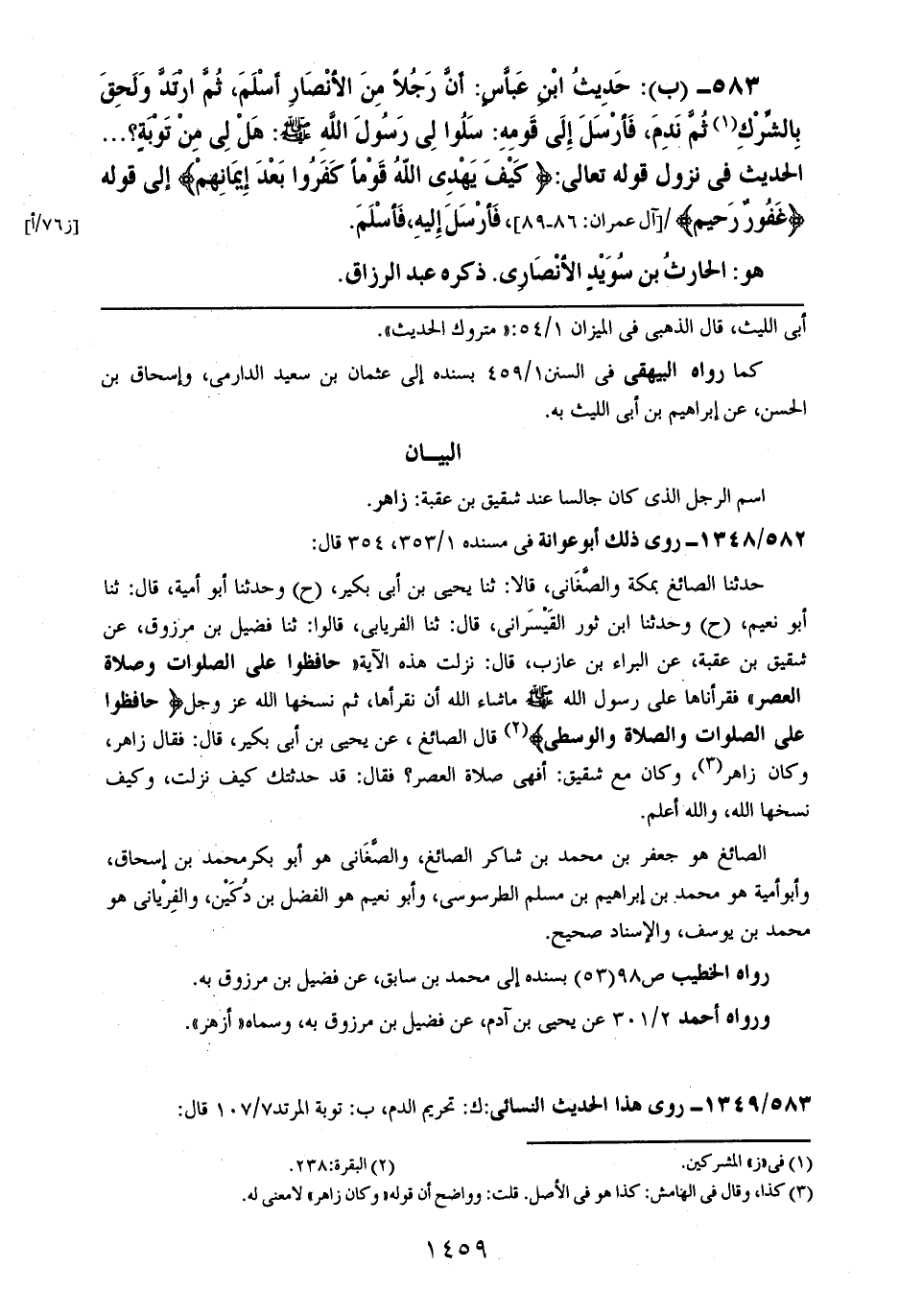 583- (ب): حديث ابن عباسٍ: أن رجلاً من الأنصار أسلم، ثم ارتد ولحق بالشرك ثم ندم، فأرسل إلى قومه: سلوا لي رسول الله صلى الله عليه وسلم: هل لي من توبةٍ؟ .. .. الحديث في نزول قوله تعالى: {كيف يهدي الله قوماً كفروا بعد إيمانهم} إلى قوله {غفورٌ رحيم}، فأرسل إليه، فأسلم.