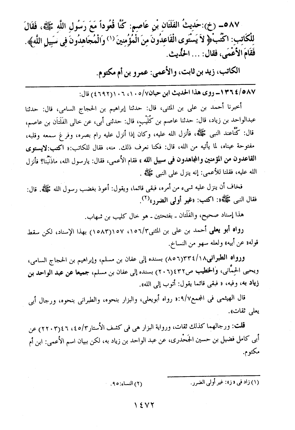 587- (خ): حديث الفلتان بن عاصمٍ: كنا قعوداً مع رسول الله صلى الله عليه وسلم، فقال للكاتب: اكتب {لا يستوي القاعدون من المؤمنين والمجاهدون في سبيل الله}. فقام الأعمى، فقال: الحديث.