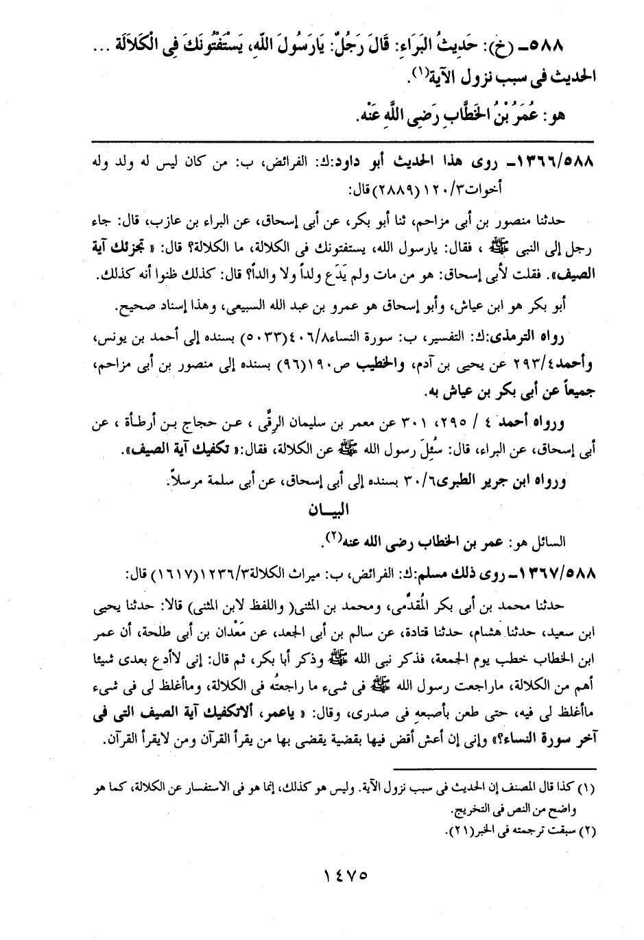 588- (خ): حديث البراء: قال رجلٌ: يا رسول الله، يستفتونك في الكلالة .. .. الحديث في سبب نزول الآية.