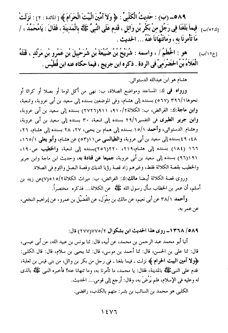 589- (ب): حديث الكلبي: {ولا آمين البيت الحرام}: نزلت فيما بلغنا في رجلٍ من بكرٍ بن وائلٍ، قدم على النبي صلى الله عليه وسلم بالمدينة، فقال: يا محمد، ما تأمرنا به، وما تنهانا عنه .. .. الحديث.