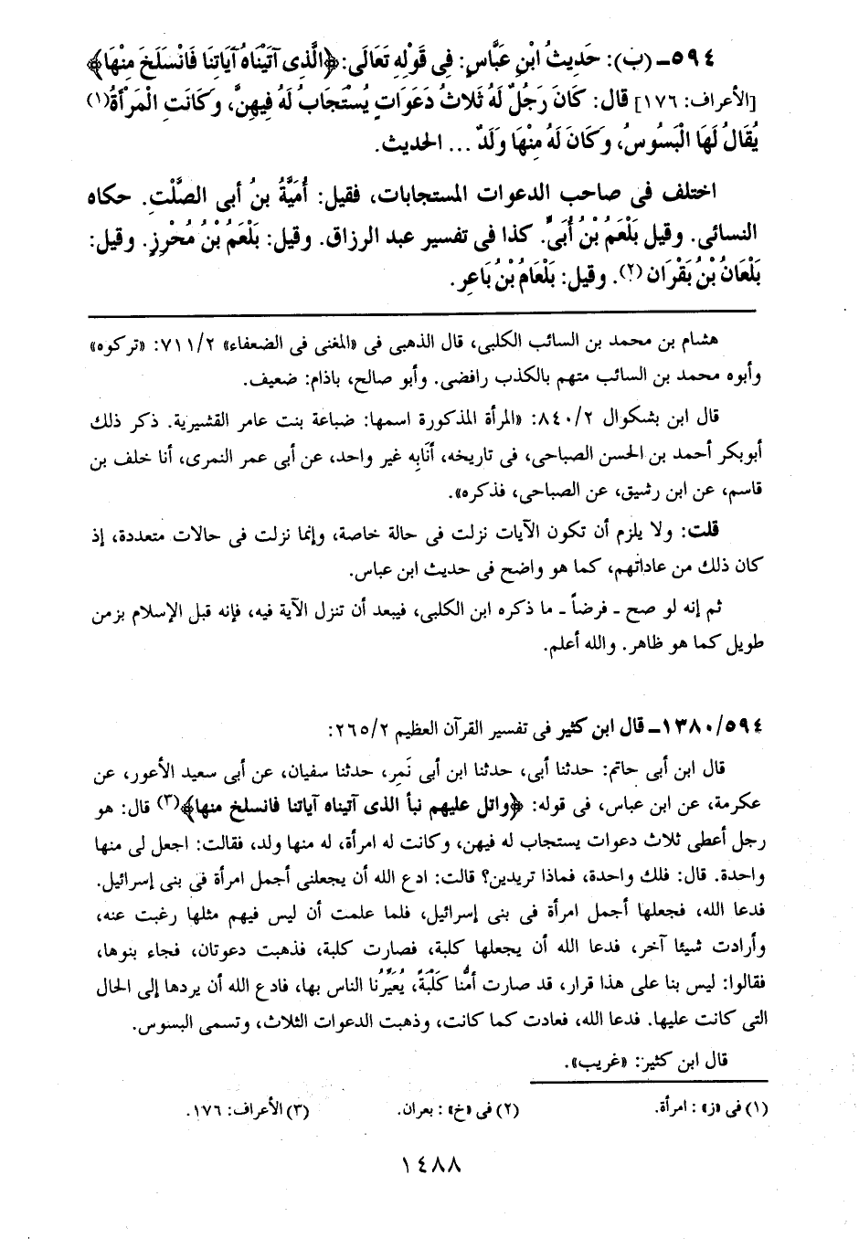594- (ب): حديث ابن عباسٍ: في قوله تعالى: {الذي آتيناه آياتنا فانسلخ منها} قال: كان رجلٌ له ثلاث دعواتٍ يستجاب له فيهن، وكانت المرأة يقال لها البسوس، وكان له منها ولدٌ .. .. الحديث.