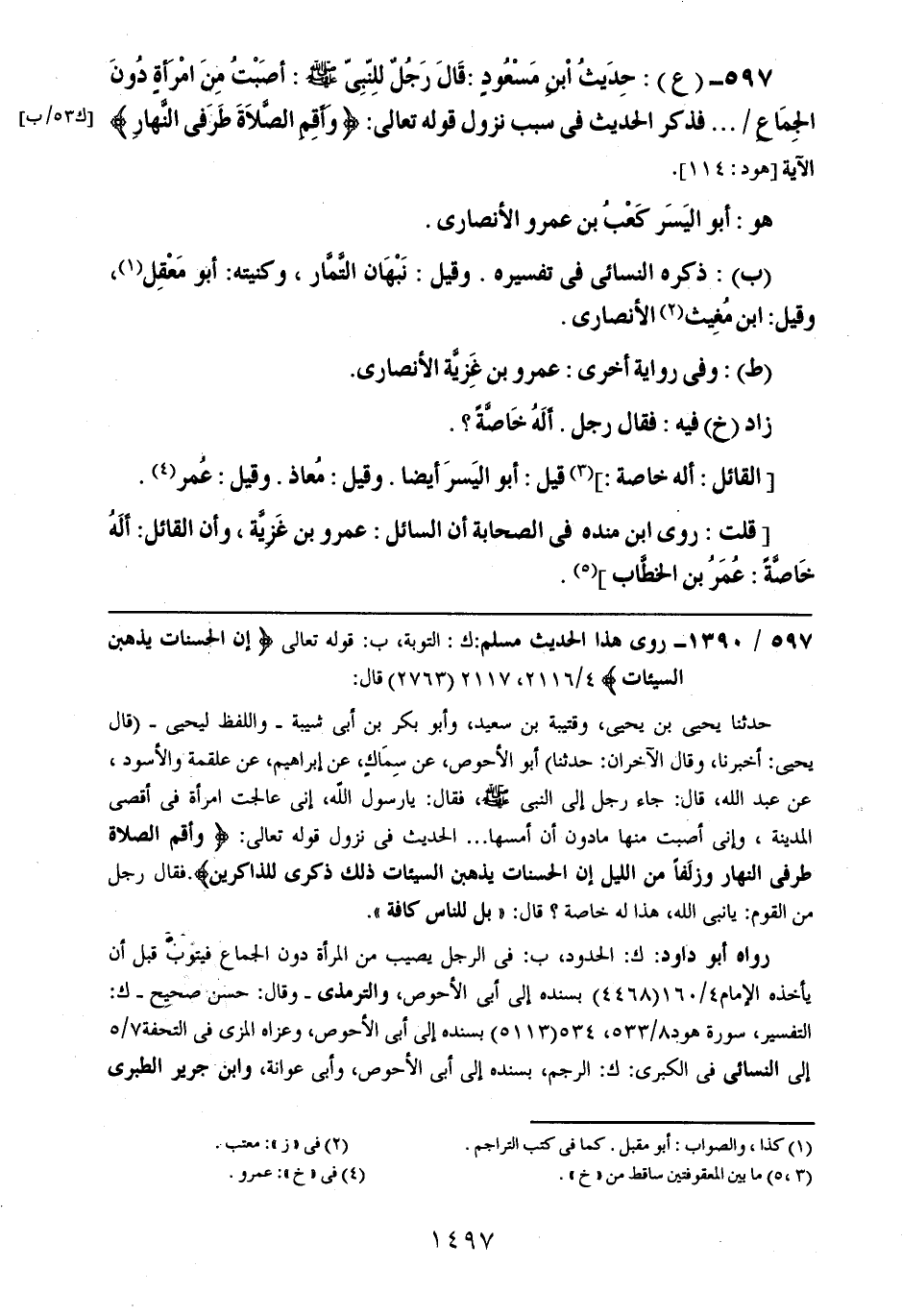 597- (ع): حديث ابن مسعودٍ: قال رجلٌ للنبي صلى الله عليه وسلم: أصبت من امرأةٍ دون الجماع .. .. فذكر الحديث في سبب نزول قوله تعالى: {وأقم الصلاة طرفي النهار} الآية.