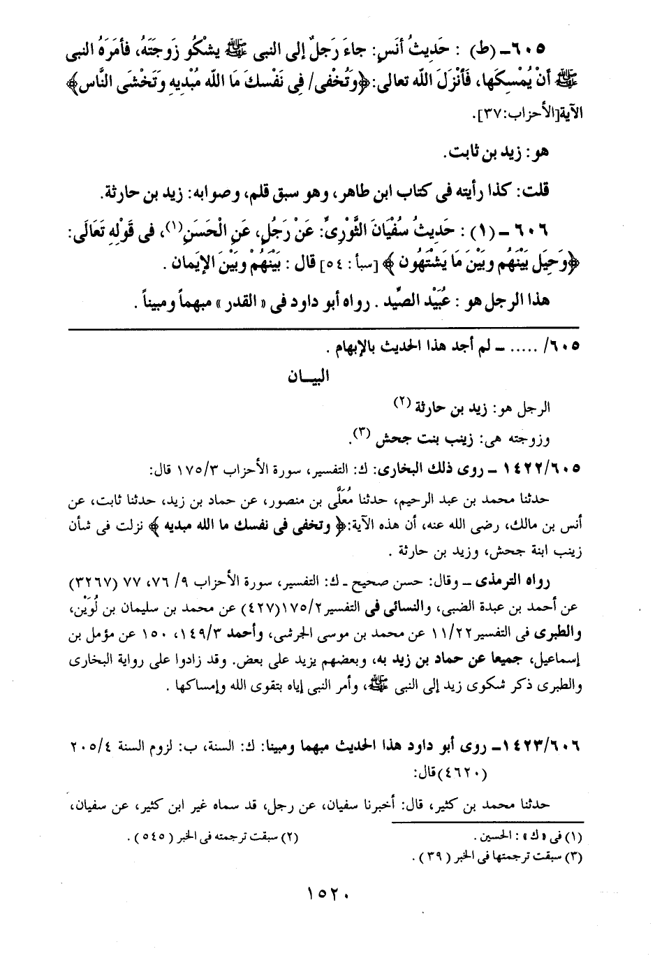 605- (ط): حديث أنسٍ: جاء رجلٌ إلى النبي صلى الله عليه وسلم يشكو زوجته فأمره النبي صلى الله عليه وسلم أن يمسكها، فأنزل الله تعالى: {وتخفى في نفسك ما الله مبديه وتخشى الناس} الآية.