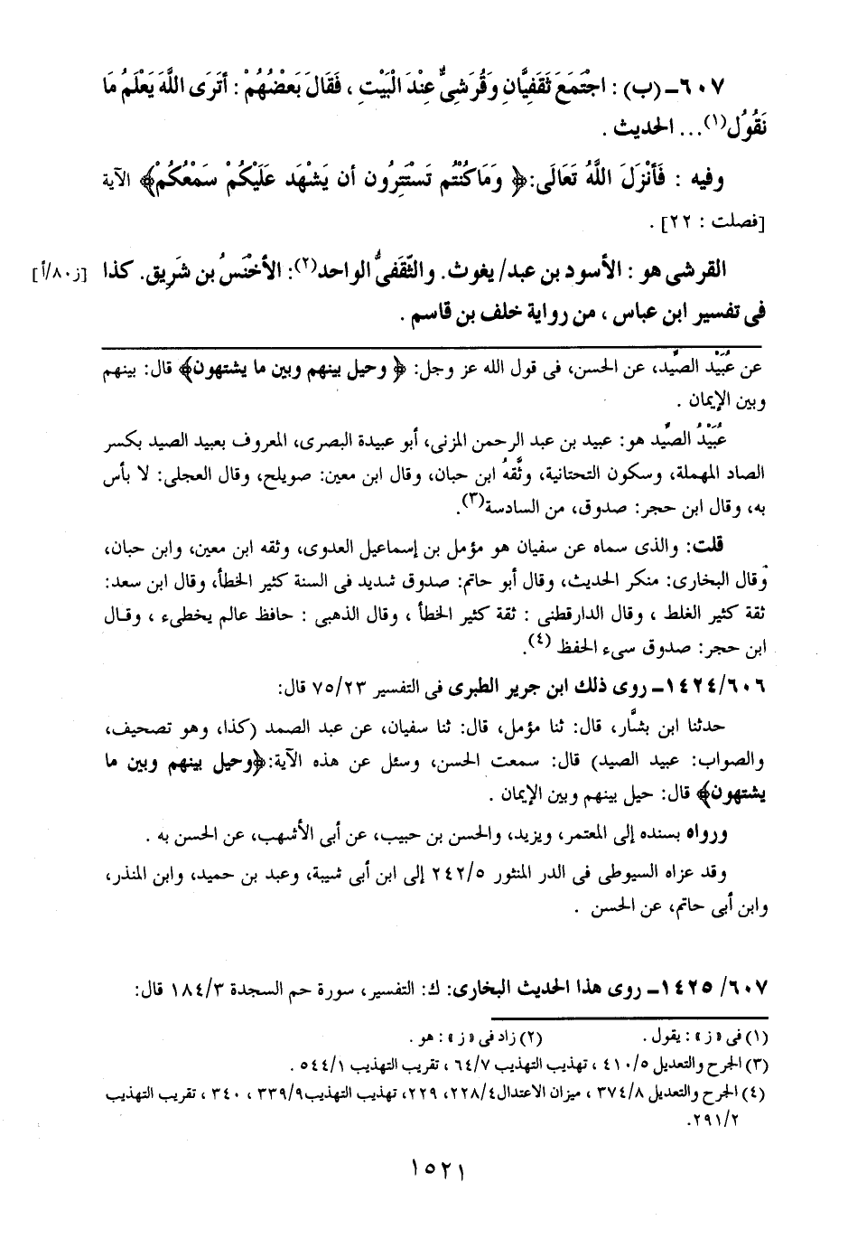 607- (ب): اجتمع ثقفيان وقرشي عند البيت، فقال بعضهم: أترى الله يعلم ما تقول .. .. الحديث.
