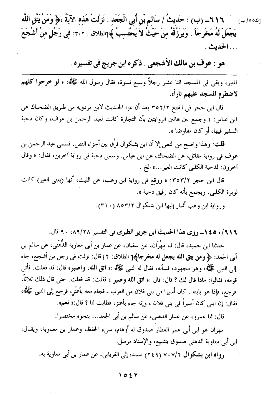 616- (ب): حديث سالم بن أبي الجعد: نزلت هذه الآية، {ومن يتق الله يجعل له مخرجاً. ويرزقه من حيث لا يحتسب} في رجلٍ من أشجع .. .. الحديث.