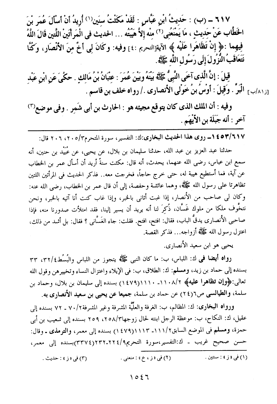 617- (ب): حديث ابن عباسٍ: لقد مكثت سنين أريد أن أسأل عمر بن الخطاب عن حديثٍ، ما يمنعني منه إلا هيبته .. .. الحديث في المرأتين اللتين قال الله فيهما: {إن تظاهرا عليه} الآية وفيه: وكان لي أخٌ من الأنصار، وكنا نتعاقب النزول إلى رسول الله صلى الله عليه وسلم.
