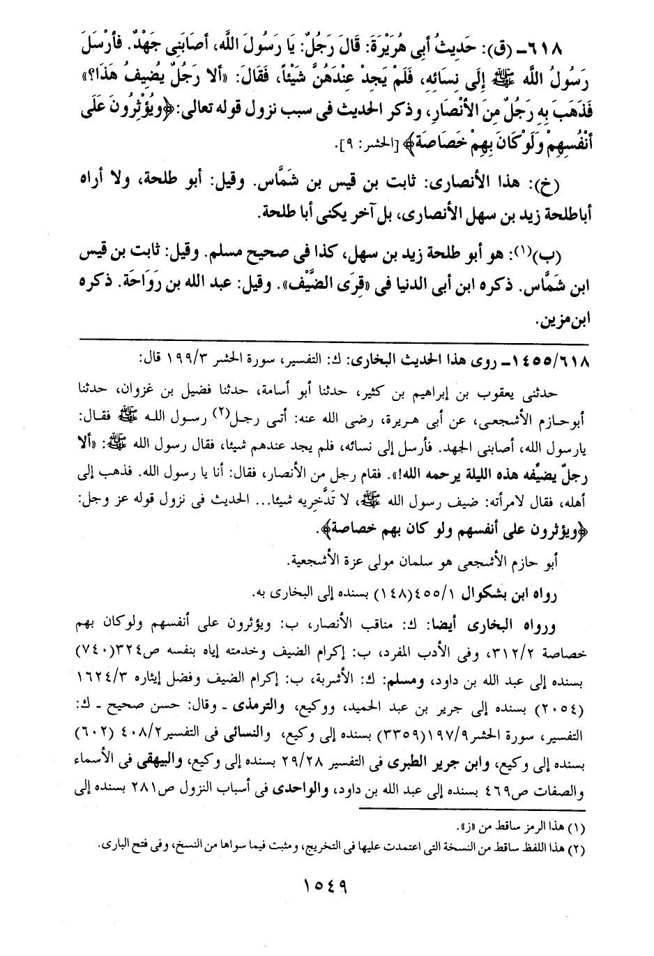 618- (ق): حديث أبي هريرة: قال رجلٌ: يا رسول الله، أصابني جهدٌ. فأرسل رسول الله صلى الله عليه وسلم إلى نسائه، فلم يجد عندهن شيئاً، فقال: ((ألا رجلٌ يضيف هذا؟)) فذهب به رجلٌ من الأنصار، وذكر الحديث في سبب نزول قوله تعالى: {ويؤثرون على أنفسهم ولو كان بهم خصاصة}.