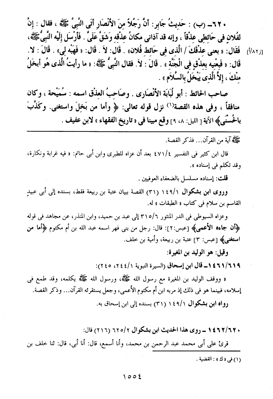620- (ب): حديث جابر: أن رجلاً من الأنصار أتى النبي صلى الله عليه وسلم، فقال: إن لفلانٍ في حائطي عذقاً، وإنه قد آذاني مكان عذقه وشق علي. فأرسل إليه النبي صلى الله عليه وسلم، فقال: ((بعني عذقك الذي في حائط فلان)). قال: لا. قال: ((فهبه لي)). قال: لا. قال: ((فبعنيه بعذقٍ في الجنة)). قال: لا. فقال النبي صلى الله عليه وسلم: ((ما رأيت الذي هو أبخل منك، إلا الذي يبخل بالسلام)).