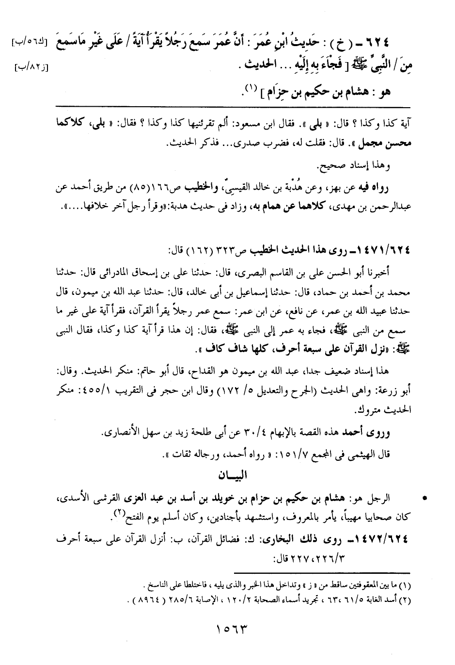 624- (خ): حديث ابن عمر: أن عمر سمع رجلاً يقرأ آيةً على غيرٍ ما سمع من النبي صلى الله عليه وسلم [فجاء به إليه .. .. الحديث.