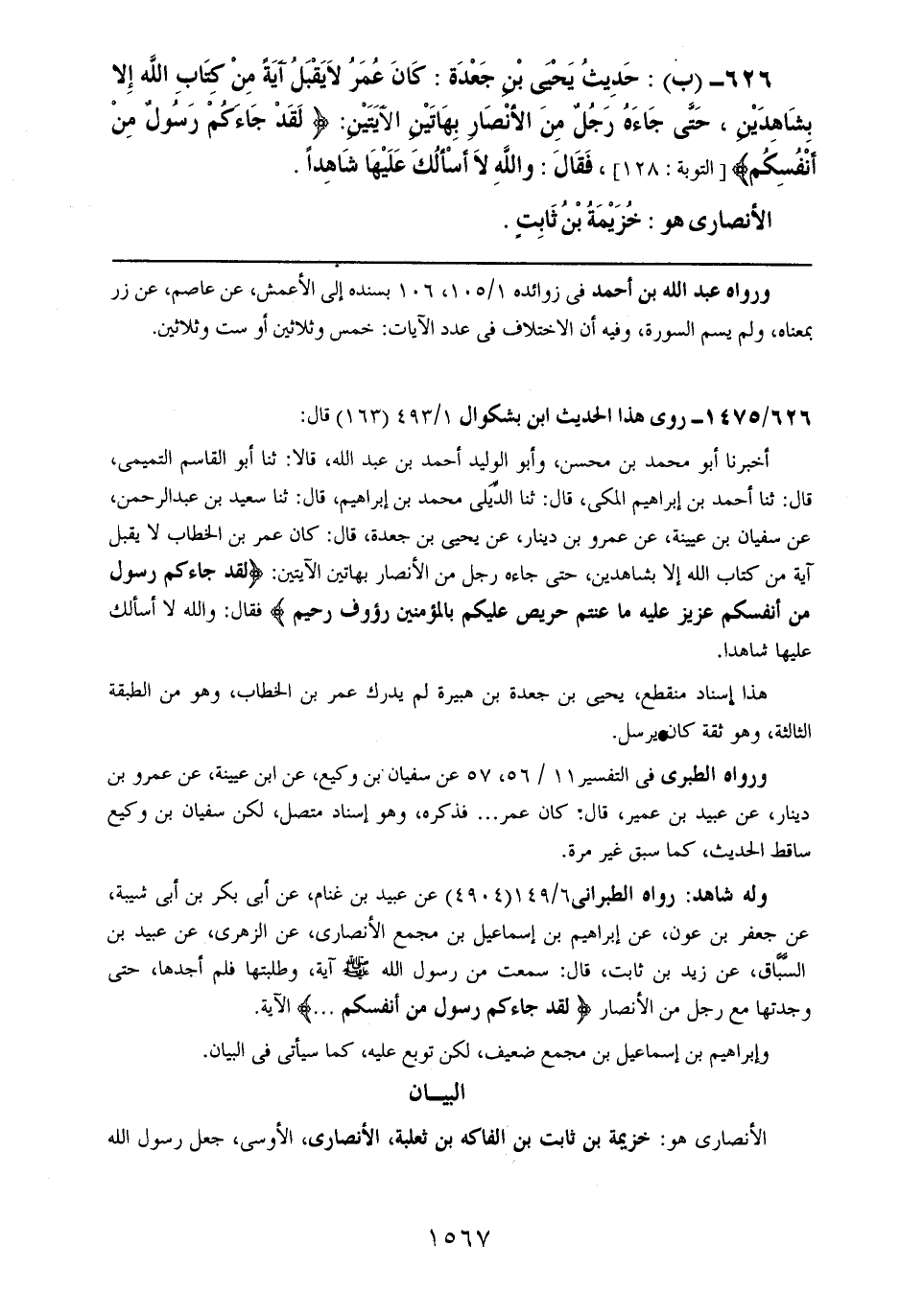 626- (ب): حديث يحيى بن جعدة: كان عمر لا يقبل آية من كتاب الله إلا بشاهدين. حتى جاءه رجلٌ من الأنصار بهاتين الآيتين: {لقد جاءكم رسولٌ من أنفسكم}، فقال: والله لا أسألك عليها شاهداً.