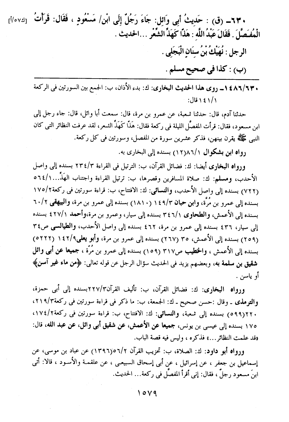 630- (ق): حديث أبي وائل: جاء رجلٌ إلى ابن مسعودٍ، فقال: قرأت المفصل. فقال عبد الله: هذا كهذا الشعر .. .. الحديث.