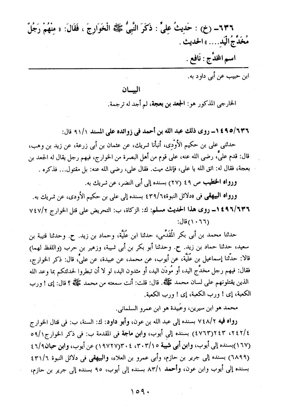 636- (خ): حديث عليٍ: ذكر النبي صلى الله عليه وسلم الخوارج، فقال: ((منهم رجلٌ مخدج اليد .. .. )) الحديث.