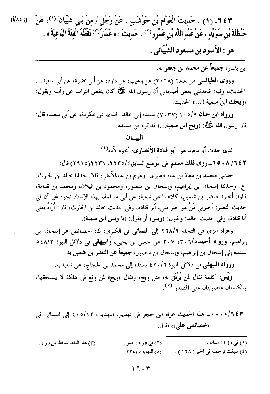 643- (1): حديث العوام بن حوشبٍ: عن رجلٍ من بني شيبان، عن حظلة بن سويدٍ، عن عبد الله بن عمروٍ، حديث: ((عمار تقتله الفئة الباغية)).