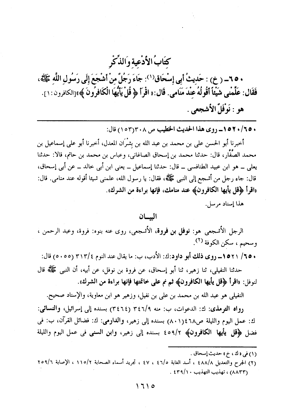 650- (خ): حديث أبي إسحاق: جاء رجلٌ من أشجع إلى رسول الله صلى الله عليه وسلم، فقال: علمني شيئاً أقوله عند منامي. قال: ((اقرأ {قل يا أيها الكافرون}.