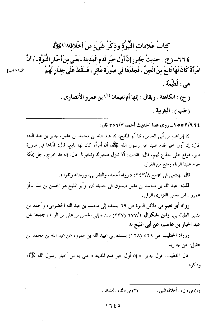 664- (ع): حديث جابرٍ: إن أول خبرٍ قدم المدينة -يعني من أخبار النبوة- أن امرأة كان لها تابعٌ من الجن، فجاءها في صورة طائرٍ، فسقط على جدارٍ لهم.