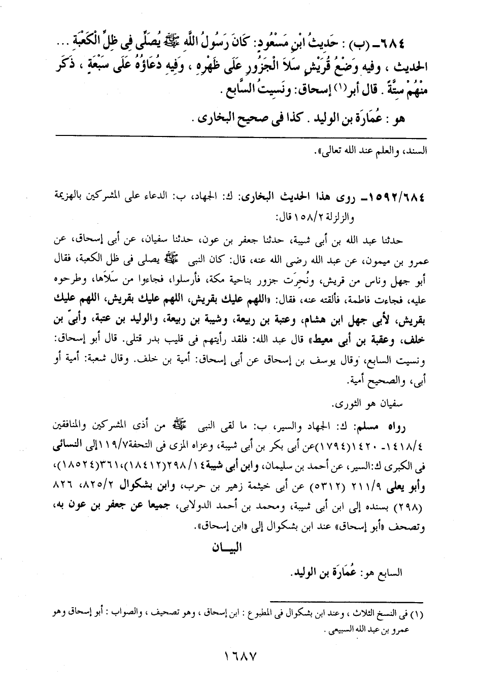684- (ب): حديث ابن مسعودٍ: كان رسول الله صلى الله عليه وسلم يصلي في ظل الكعبة .. .. الحديث، وفيه وضع قريشٍ سلا الجزور على ظهره، وفيه دعاؤه على سبعةٍ، ذكر منهم ستةً. قال أبو إسحاق: ونسيت السابع.