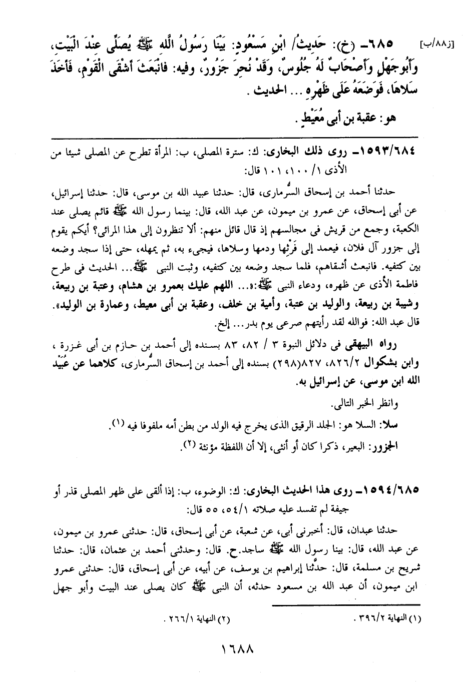685- (خ): حديث ابن مسعودٍ: بينا رسول الله صلى الله عليه وسلم يصلي عند البيت، وأبو جهلٍ وأصحابٌ له جلوسٌ، وقد نحر جزورٌ، وفيه: فانبعث أشقى القوم، فأخذ سلاها، فوضعه على ظهره .. .. الحديث.