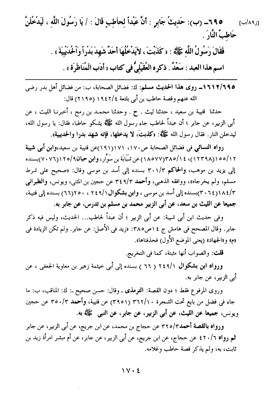 695- (ب): حديث جابرٍ: أن عبداً لحاطبٍ قال: يا رسول الله، ليدخلن حاطبٌ النار.