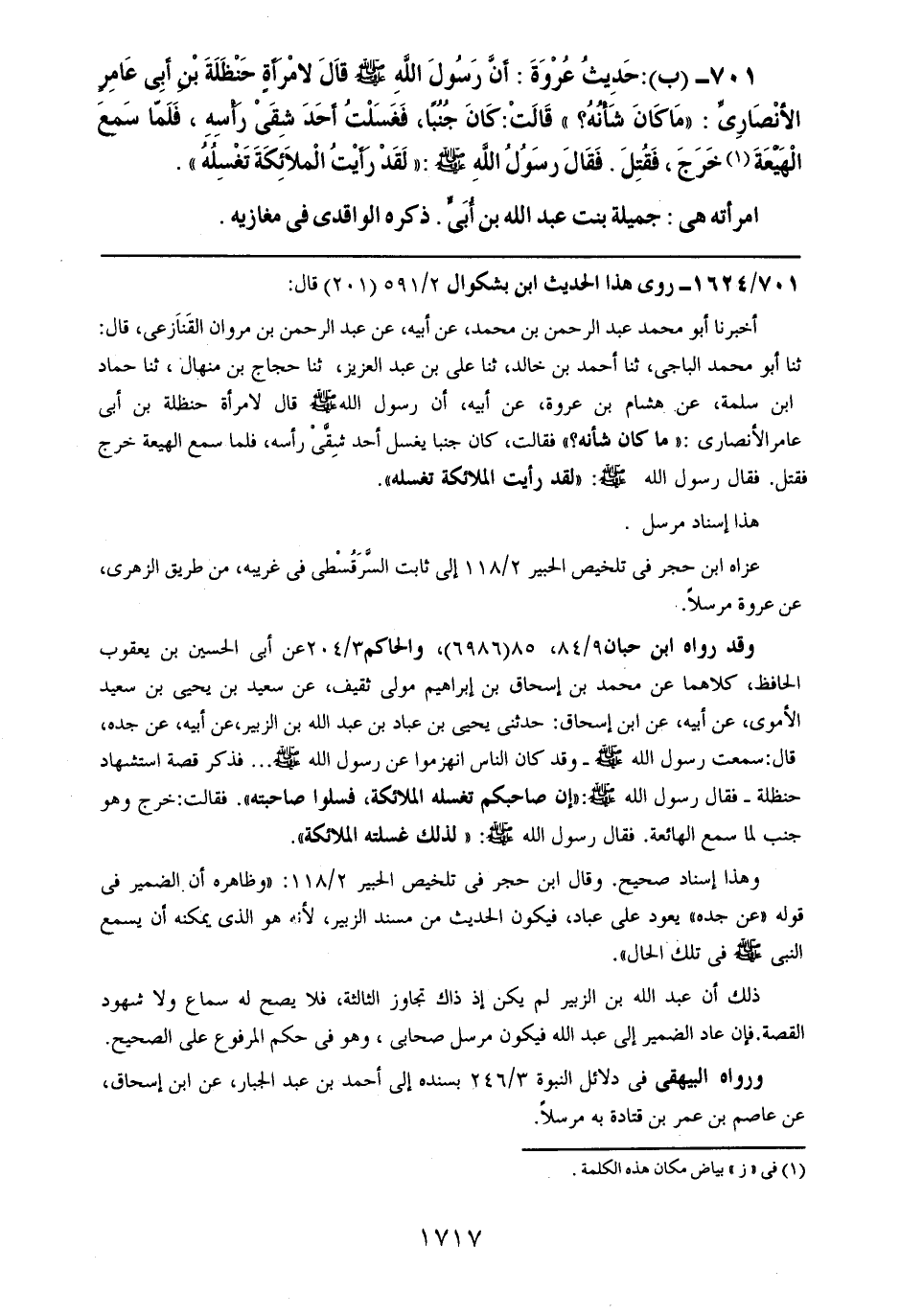 701- (ب): حديث عروة: أن رسول الله صلى الله عليه وسلم قال لامرأةٍ حنظلة بن أبي عامرٍ الأنصاري: ((ما كان شأنه؟)) قالت: كان جنباً، فغسلت أحد شقي رأسه، فلما سمع الهيعة خرج، فقتل. فقال رسول الله صلى الله عليه وسلم: ((لقد رأيت الملائكة تغسله)).