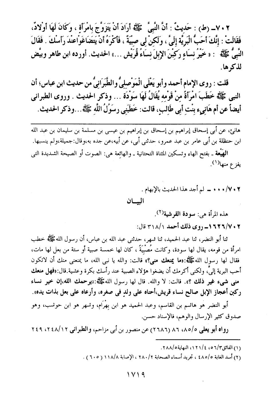 702- (ط): حديثٌ: أن النبي صلى الله عليه وسلم أراد أنه يتزوج بامرأةٍ، وكان لها أولادٌ، فقالت: إنك أحب البرية إلي، ولكن لي صبيةٌ، فأكره أن يتضاغوا عند رأسك. فقال النبي صلى الله عليه وسلم: ((خير نساء ركبن الإبل نساء قريش .. .. )) الحديث. أورده ابن طاهر وبيض لذكرها.