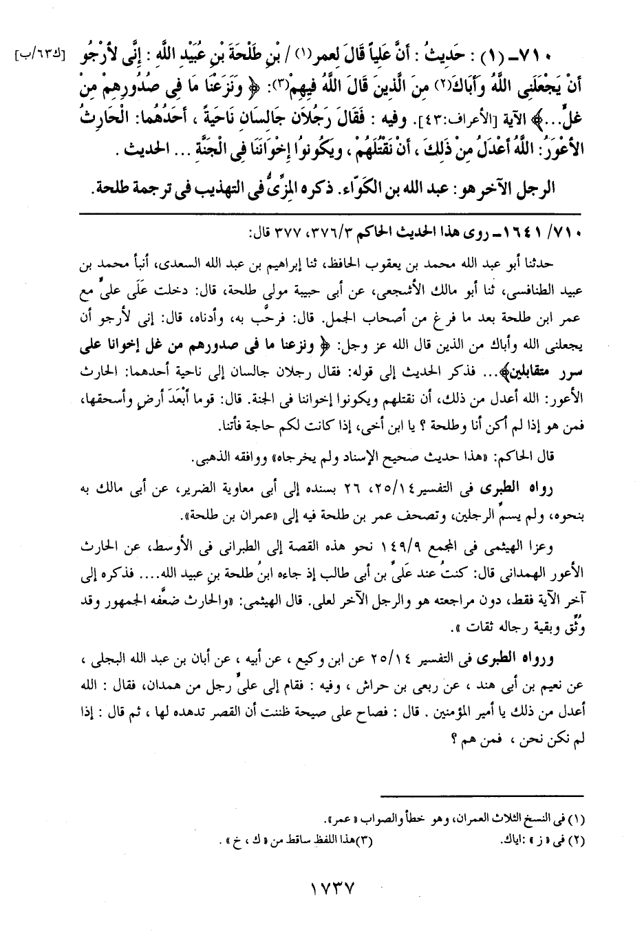 710- (1): حديث: أن علياً قال لعمر بن طلحة بن عبيد الله: إني لأرجو أن يجعلني الله وأباك من الذين قال الله فيهم: {ونزعنا ما في صدورهم من غلٍ .. .. } الآية. وفيه: فقال رجلان جالسان ناحيةً، أحدهما: الحارث الأعور: الله أعدل من ذلك، أن نقتلهم، ويكونوا إخواننا في الجنة .. .. الحديث.