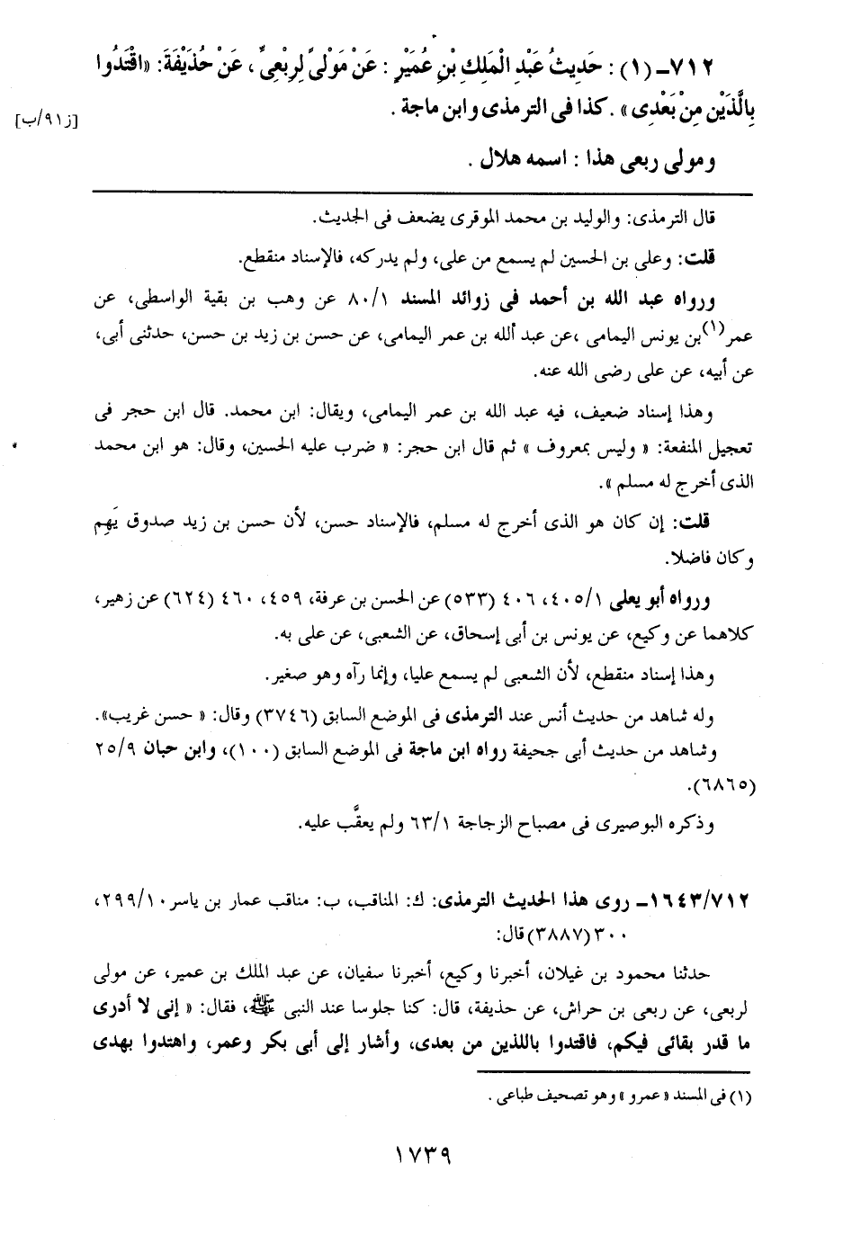 712- (1): حديث عبد الملك بن عمير: عن مولى لربعي، عن حذيفة: ((اقتدوا باللذين من بعدي)). كذا في الترمذي وابن ماجة.