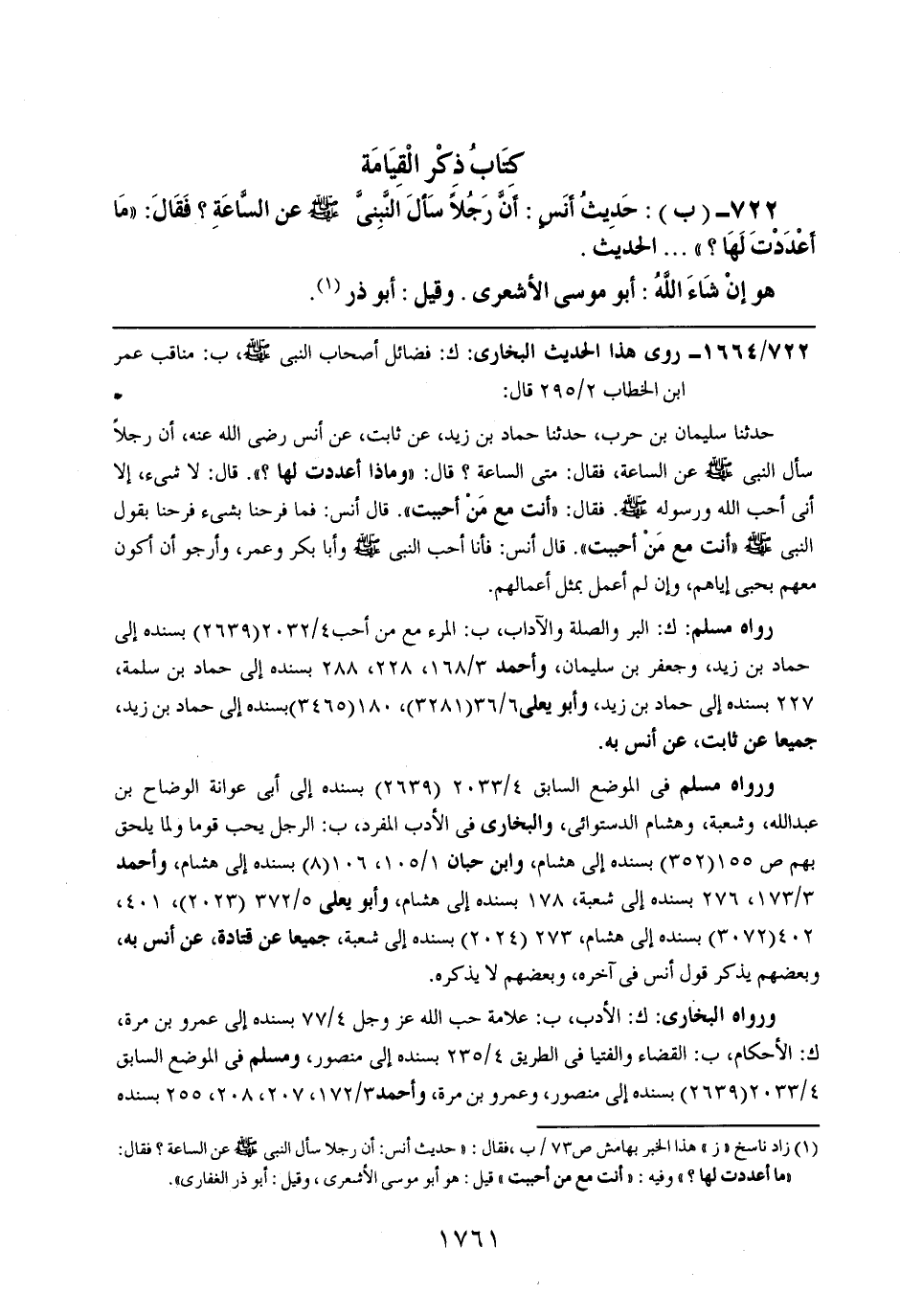 722- (ب): حديث أنسٍ: أن رجلاً سأل النبي صلى الله عليه وسلم عن الساعة؟ فقال: ((ما أعددت لها؟)) .. .. الحديث.