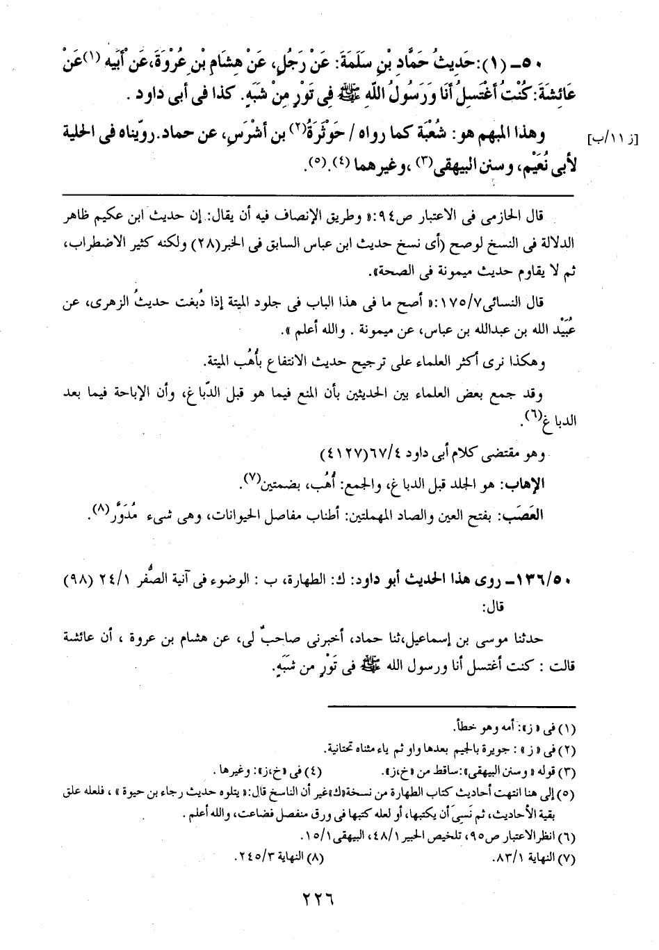 50- (1): حديث حماد بن سلمة: عن رجلٍ، عن هشام بن عروة، عن أبيه عن عائشة: كنت أغتسل أنا ورسول الله صلى الله عليه وسلم في تورٍ من شبهٍ. كذا في أبي داود.