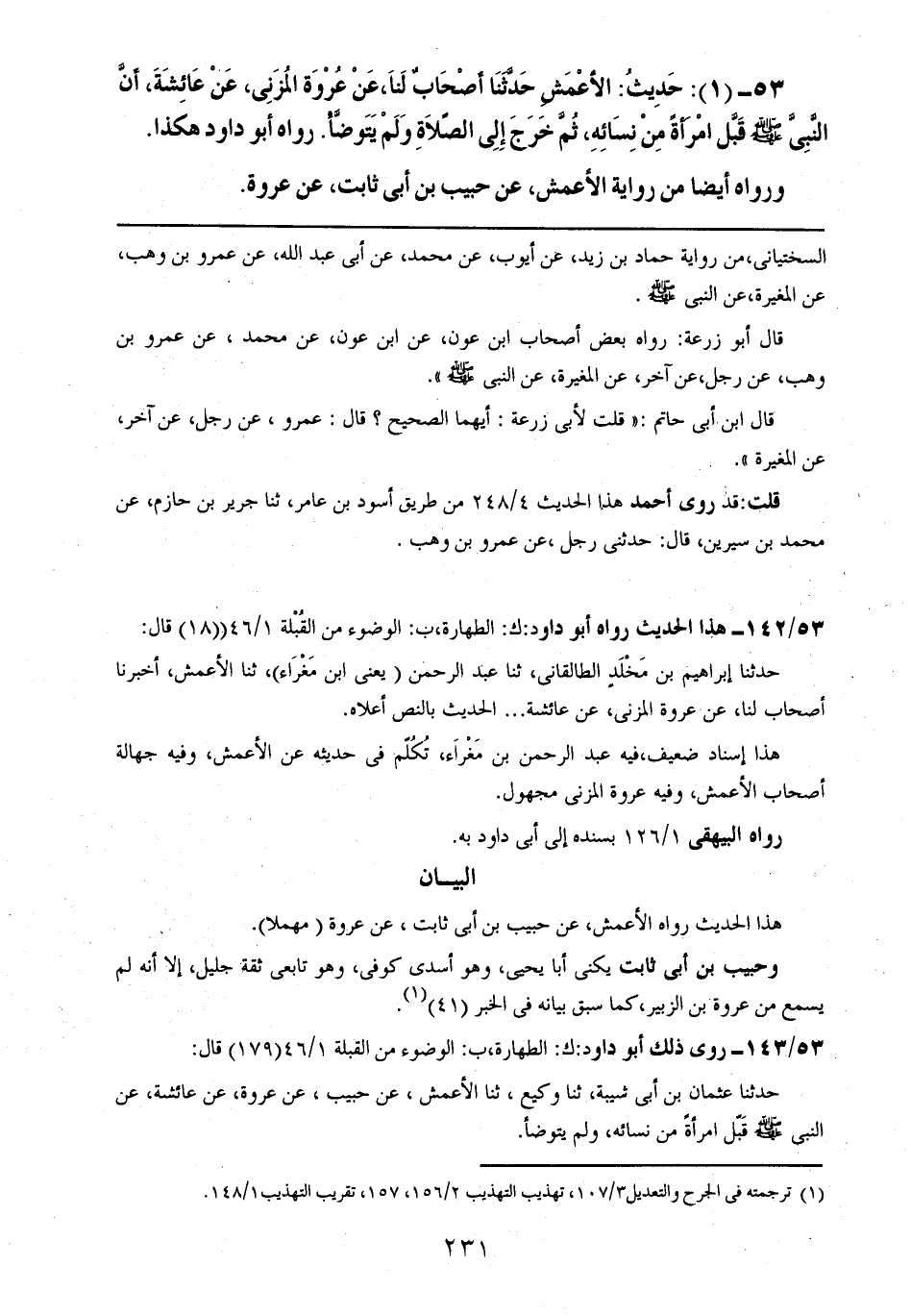 53- (1): حديث: الأعمش حدثنا أصحابٌ لنا، عن عروة المزني، عن عائشة، أن النبي صلى الله عليه وسلم قبل امرأة من نسائه، ثم خرج إلى الصلاة ولم يتوضأ. رواه أبو داود هكذا.